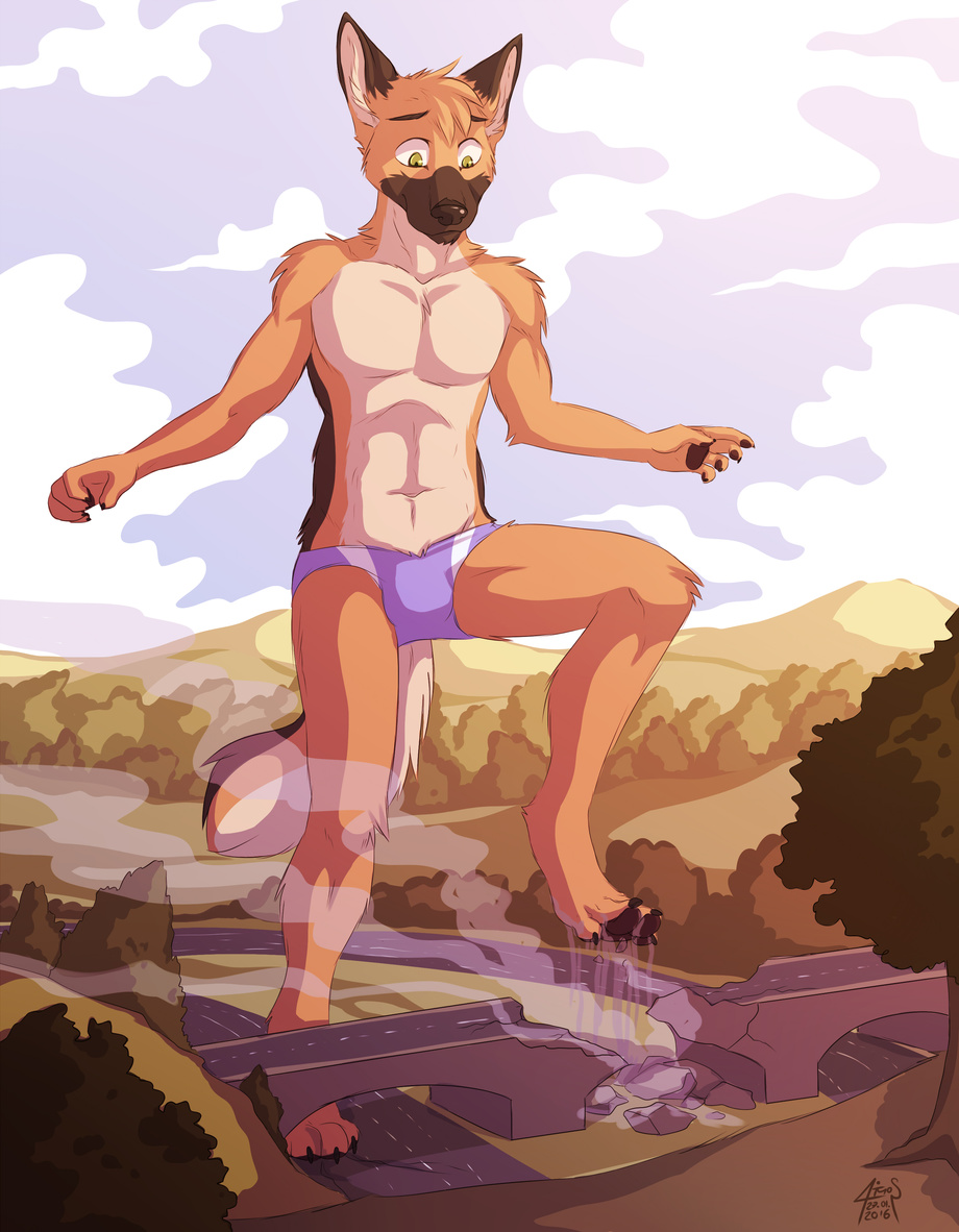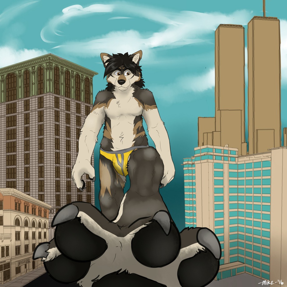 Having made some new macro friends and getting to know how the world goes about and the importance between macros and micros it was time for Christian to let the micro world he now lives in know him and what he's really like. Having got up in the midst of a small forest he washed himself and his loincloth in a small lake and took a look around and seeing just how small and delicate everything was. As he looked around he noticed a plane in the sky above him and watched as it flew above him and towards a large city. Seeing the tall skyline of this city he decided that he would take a walk into the city. With his loincloth still drying he put on his brief underwear and inhaled a deep breath and slowly walked from the forest towards the city. Ahead of the city was a small town with a lot of houses and a few stores. As he got towards the town he slowly walked through the tiny streets looking down and around with a slightly nervous look. As he did he noticed in the backyard of one of the houses was a swimming pool. He stepped towards the house and bent over down to the pool and started to drink the water! As he did he heard a scream and looked into the house to see a family looking out of the window. He smiled at them and then stepped back into the middle of the street. When he did he looked down to see those living there had come out and were looking up at him. He smiled at them and gently waved at them before making his way down towards the city. Like any macro his presence was suddenly felt with the shaking of the ground and loud thumping that got louder and heavier. Remembering what his new friends had told him about cities and micros, Christian slowly walked into the city one giant step at a time looking down and smiling as he went down the small city streets. As he went through the city he could hear and see micros running and screaming away from him. Once he was in the middle of the city he stopped and looked around at the tall buildings up high and tiny things in the streets below. "Hi!" said Christian with a loud, deep and booming voice. "I'm Christian. I'm a giant wolf from another realm." Those in the streets looked up at him wondering what he was going to do or say next. "I won't hurt you. I just wanted to see what a city is." Those in the city could see straight away that he was not the sort of giant who would be evil and destructive and as such became more welcoming to him and less afraid. "I think I'll go now." And with that he turned around with his tail scraping one or two buildings as he did. Immediately he heard the screams and turned back to see parts of the buildings fall. He reached his hands out and grabbed the falling debris in both hands and put it onto a building. The crowds who were below started to cheer as Christian managed to save them. "Thank you" He said as looked back down at the crowd and smiled. Slowly turning back around he made his way out of the city to the open countryside to find his other macro friends to tell them where he had been and what had happened.