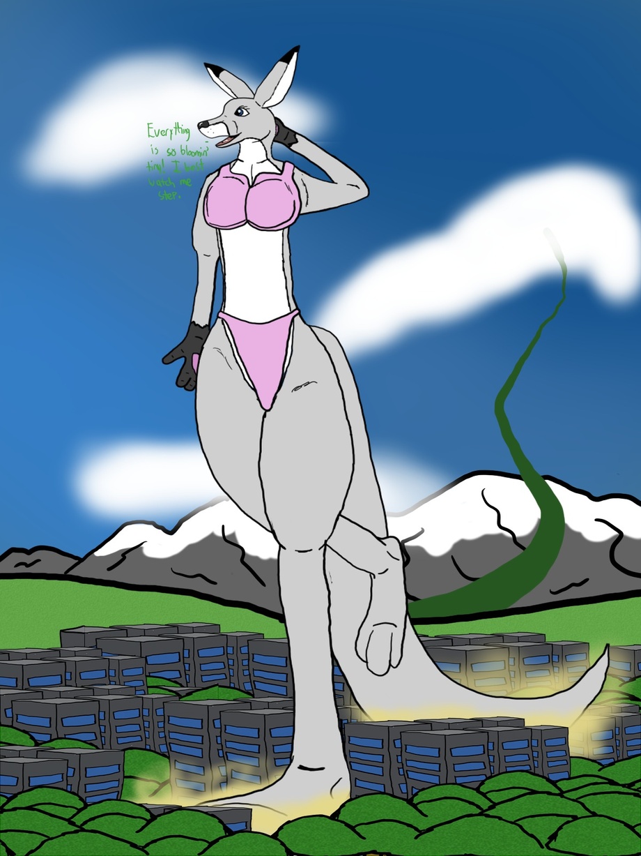 Big female kangaroo, Silva (usually seen with Miku) goes for a stroll in her bikini, I suppose looking for a beach to relax at.