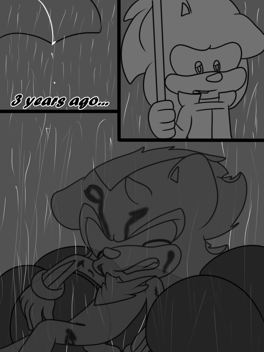 The weather is clear and nice for being a desert. Why does the last panel on this flash back page cause me to think that Shadow is a stray cat that Sonic found in the rain? XD