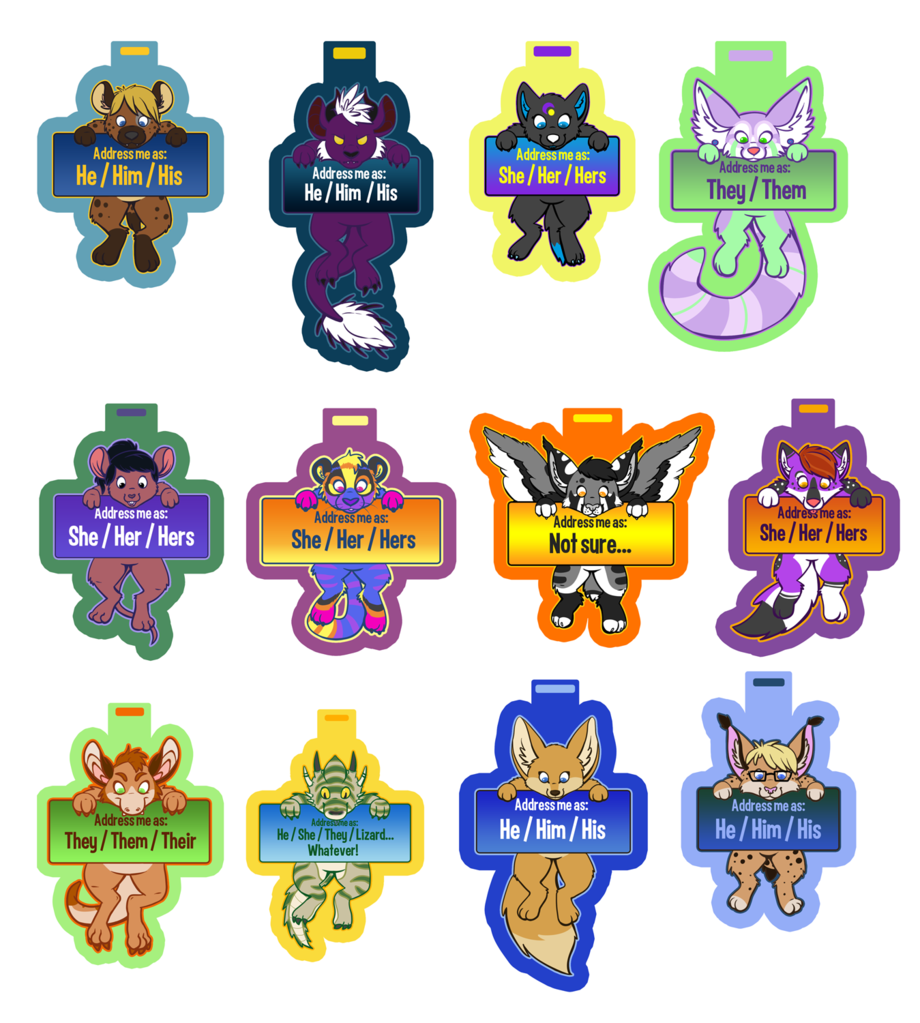 I've done a whole bunch more of these, but here are some of the pronoun badges I've done lately! I'm still open for these, they are $15 each, including lamination and shipping. :)
