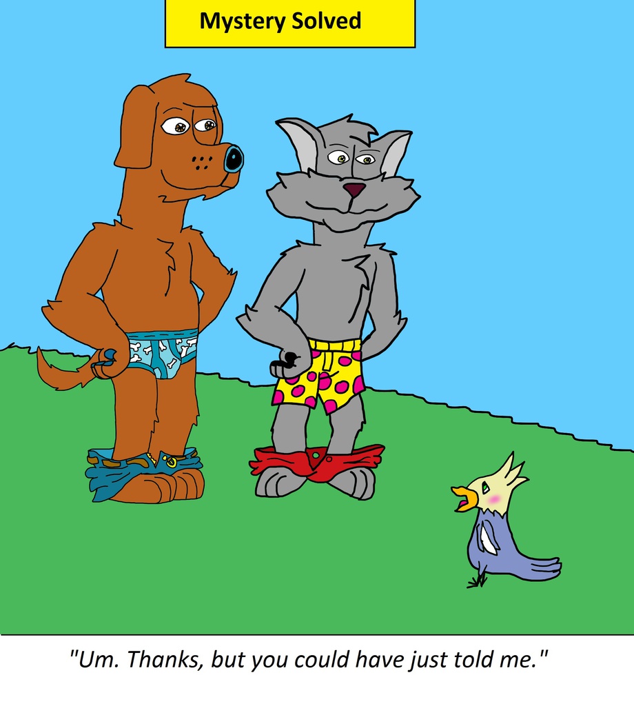Thanks! Those are the ones I designed! The comic strip I drew this from already designed the cat's undies, and I felt like the dog's tighty whities could use a little sprucing up.