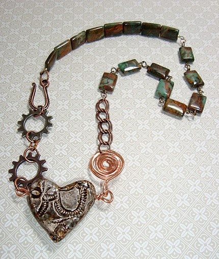 This 20 inch side clasping necklace is different from my other steam punk works by the fact that it includes a generous amount of the semi precious stone in 14mmx9mm puffed pillows known as green copper opal. It also features mixed metals from pewter to copper to brass in them form of chains,hooks,rings and eye pins.The copper spiral within a spiral is my own hand made creation.The necklace focal point is a large 35mmx35mm handmade porcelain clay heart purchased right here on Etsy from the talented seller at www.artrageousclay.etsy.com