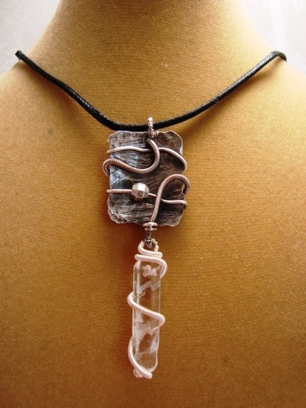 A sterling silver dog tag thats been textured,is wrapped in sterling wire,coils and accented by a faceted sterling silver bead.All is oxidized,buffed and the scratched uo for a urban look whilst a quartz crystal point is wrapped in sterling silver wire over annealed steel wire.Pendant hangs from faux black 18 inch leather cord that closes with a hand formed sterling silver hook and eye clasp.