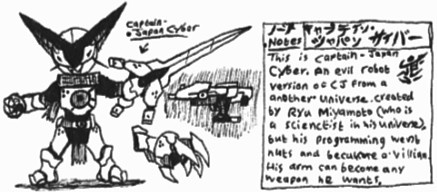 Captain-Japan Cyber キャプティン・ジャパン・サイバー: This is an evil robot version of Captain-Japan from another universe. He was created by Ryu Miyamoto (who is a scientist in his universe), but his programming went nuts and killed Ryu and became a supervillain. He can change his arm into any weapon he wants in combat.