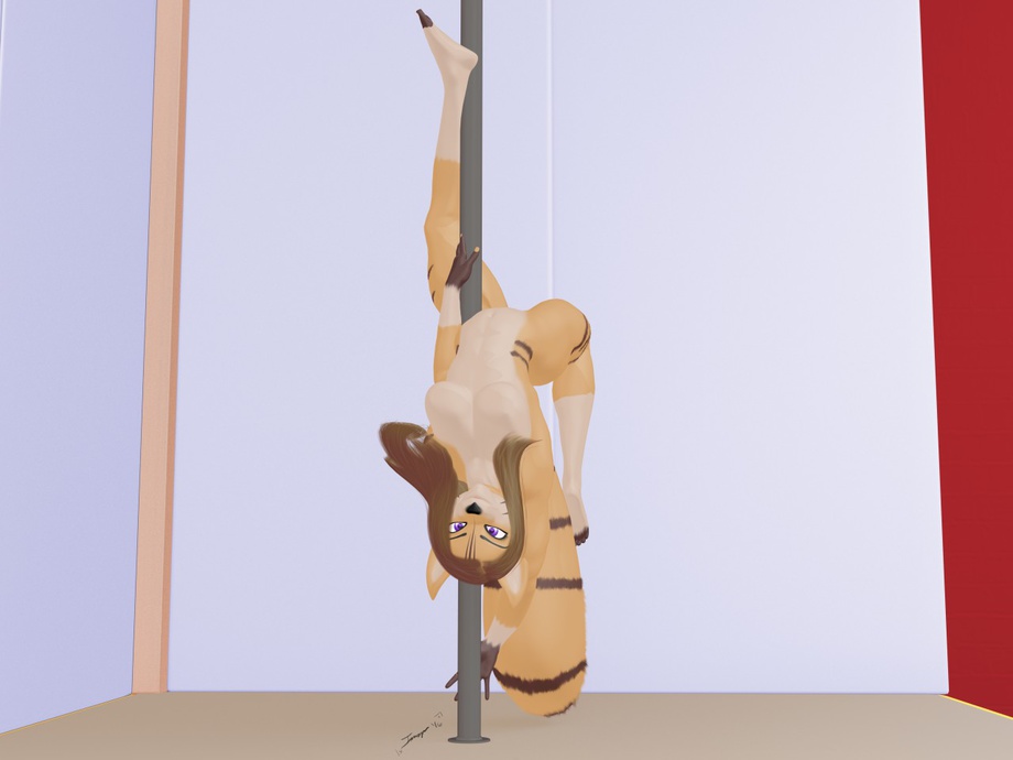 Polyxena showing off her strong thigh and arm muscles as she holds herself suspended on the pole. She looks out at the audience who might be wondering... How long can she stay like that? The answer... With those thighs of steel... A very long time.