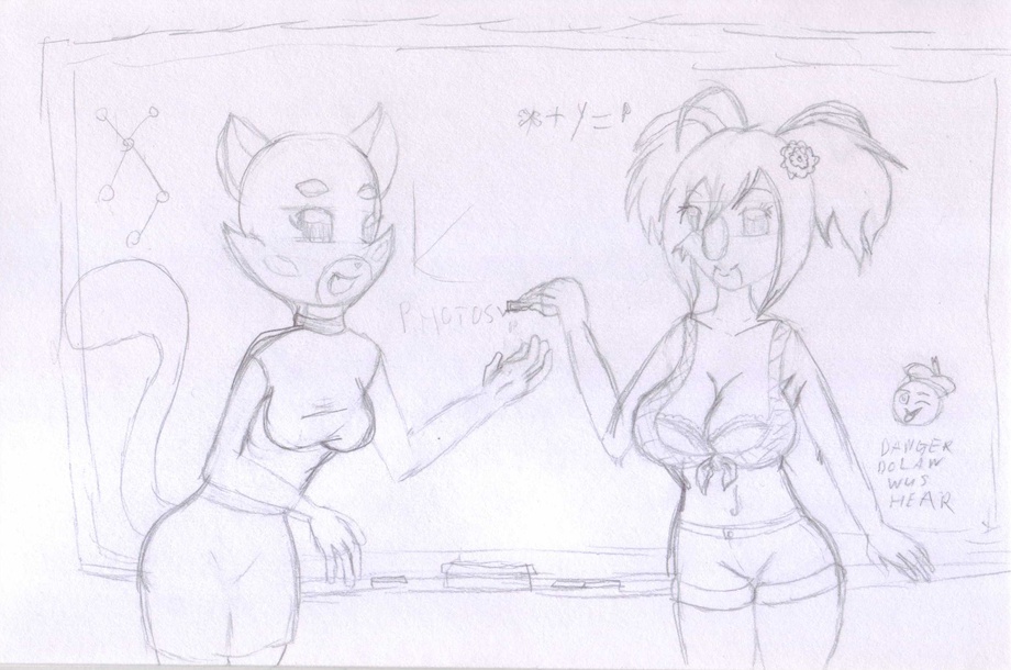 Me and my sweetheart have been watching a lot of Danger Dolan and have enjoyed the videos for the longest while. I then had this idea just recently and quickly sketched this of Shima and Chloe teaching a class together since Chloe is a qualified teacher and all. Overall I really liked how this came out though I probably won't be inking or colouring this any time soon but I hope you all will still enjoy this simple little sketch. n_n
