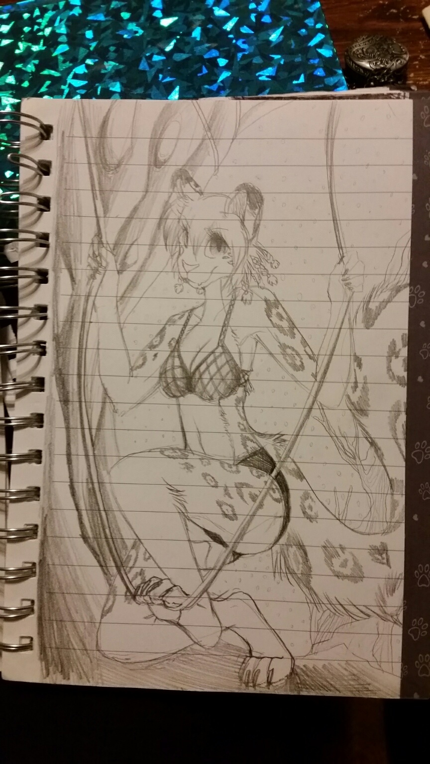 I'm gonna start posting my notepad sketches, my other characters need some love too! This is my Snow Leopard....her name is Symphel Leopin. I was waiting for my mom to pick em up from work back when I worked at the deli and decided I wanted to doodle her climbing into a cave or something. x3 I might finish it digitally, enjoy!