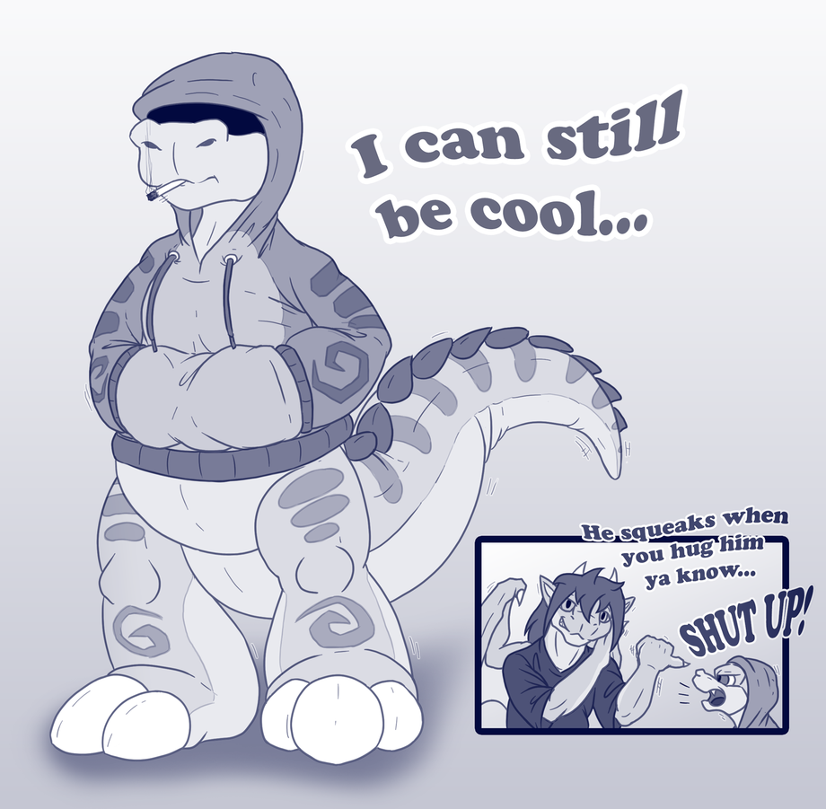 Being a little cute looking cartoony lizard can have serious impacts on your coolness factor, though he's trying to cope with it, and my blatant sabotage
