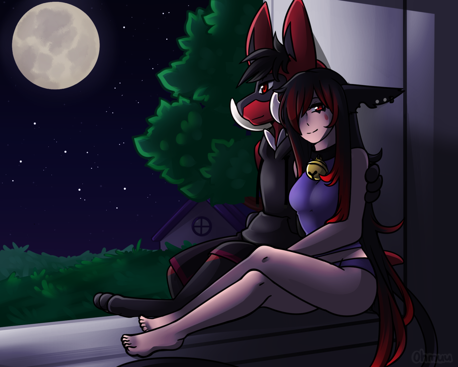 The chill of the imposing autumn night winds nipped at her bare skin through the open window, yet she paid it no mind. Ren rarely expressed any adverse effects the cold weather had on her. The darkness demi-god catgirl sat upon a wide window sill on the top floor of the Euphoria Escorts building, away from the chatter and noise of the dwelling’s other occupants. The room she was in was completely dark and barren; a recent addition to the building, it didn’t even have proper bedding or lighting, a small futon laying in the corner surrounded by what looks like a bird’s nest of random pillows and blankets she had stolen from the others or some other place nearby. This is how she preferred it: no one to bother her, no one to get in the way, no one to hurt her. Just peace and solitude in the dark, with only the light of the moon above her to illuminate her surroundings.