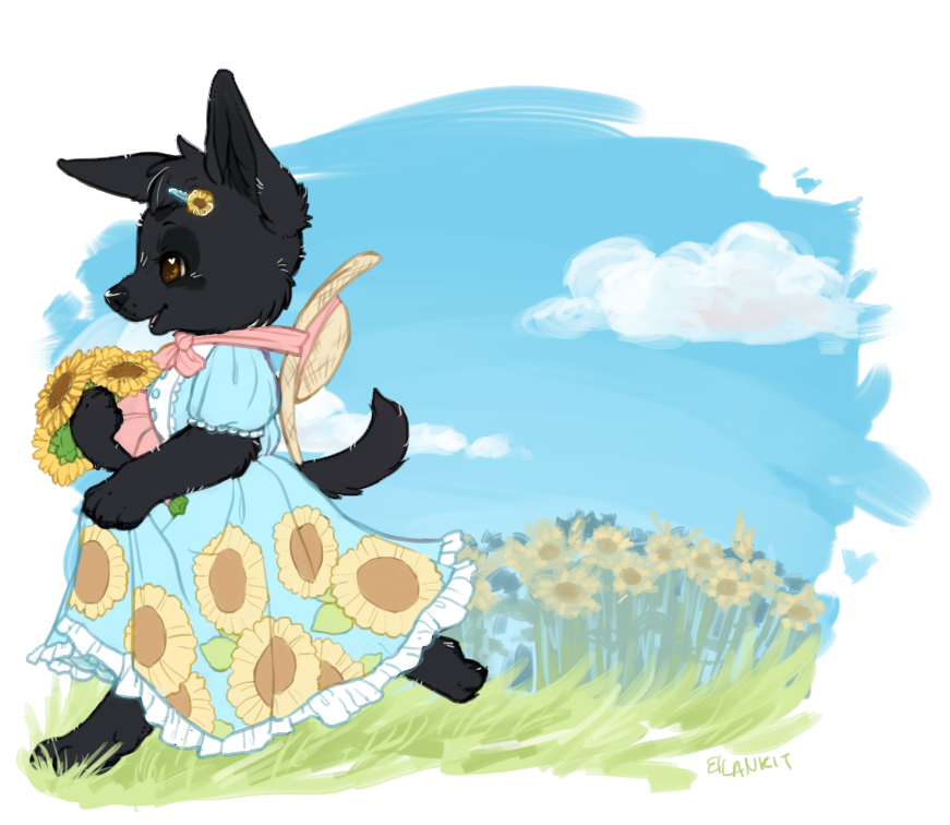 She requested her Shepherd in a sunflower themed dress. It's been a good long while since I've drawn country lolita inspired garb, so I put them in a cute little classic looking dress.