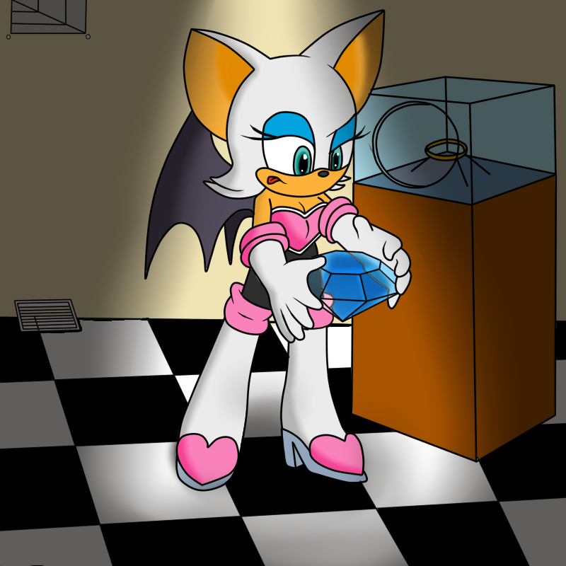 rouge was dressed for a warm spring day and payed a visit to the small towns museum. though there wasn't much to be seen there was one object that had caught her eye. The stone of ages. she read a description. this gem was discovered 80 years ago in a ancient ruin and named stone of ages by its discoverers. Although this gem resembles a chaos emerald it is believed to have been used as a decoy to trick would be thief. rouge stopped reading and started to take mental notes of the lay out of the building and its security. and noticed how poor it was. part of her felt like this was some sort of trap but if it wasn't and she waited someone else would be able to steal that gem long before her. that night she spent a good hour looking around the area for any hidden cops waiting in dark. being a bat they couldn't possibly hide well enough from her but found nothing. a small town like this couldn't have had more then 10 or 12 to start with. fighting her unease she made her way into the museum and past each alarm and cameras getting to the case her gem was in she used a class cutter and reached in to pick up her prize. and admired its blue shine. within seconds she felt odd as it seemed to be getting bigger and heavier. in only seconds she was a head shorter then when she picked the stone up. quickly she read the description. decoy to trick thief's while it can be given without effect when stolen the gem would case would be thief's to regress to infancy as discovered during the night it was recovered. farther tests showed while most people would return to normal after giving back the stone to its current owner anyone who stole in the past wouldn't reverted until All they have stolen was returned. rouge turned white at the thought. she didn't even remember who she stole half her gems from when she felt a draft. looking down she saw her clothes had completely changed she was barely half the height of the display case her clothes now a yellow dress and boots turned into sneakers. she could even feel her underwear growing thicker as they became training pants. she started to panic. knuckles fox friend could fix this. she just had to get out of here. she eyed the exits. the air ducts were the fastest way out at her new size she'd be able to get through even easier then before but her wings were shrinking with her and was unsure she could get that high with the gem weighting her down. suddenly she yawned the gems weight slowly pulled her to the ground. she was so small her dress had fallen off unfolding and spreading across the floor becoming a fuzzy blanket her sneakers little more then fabric baby booties and her once silk underwear a thick crinkly diaper. she laid down her eye lids becoming heavy. it was way past a bats bedtime let alone a babies. she'd just take a nap quickly before making her escape.
