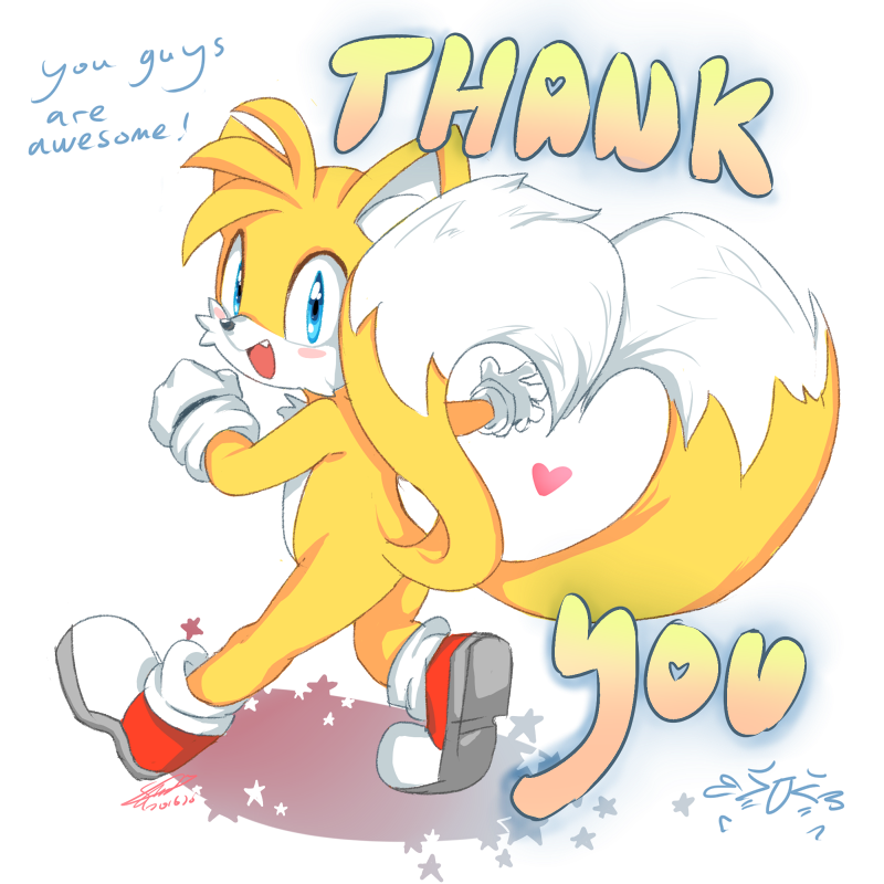 And you Deserve a Thank you as well. I enjoy your artwork very much, I have an entire folder with all the art you've uploaded in it saved to my desktop, even some of the older stuff I managed to find on other sites =) Your talent is amazing and you have in fact, inspired me. I have little to no confidence in my art so I don't upload it but I try to do my best and every time I see your art it makes me want to try again so I do and I hope I get better, you've been a driving force for me to not give up and keep trying. it may sound a bit silly but Thank you Soina, Your work is beautiful and I love seeing it every time. That's an absolutely adorable Tails as well ^^ Glad you're feeling better and can't wait for the game =D take as long as you need to