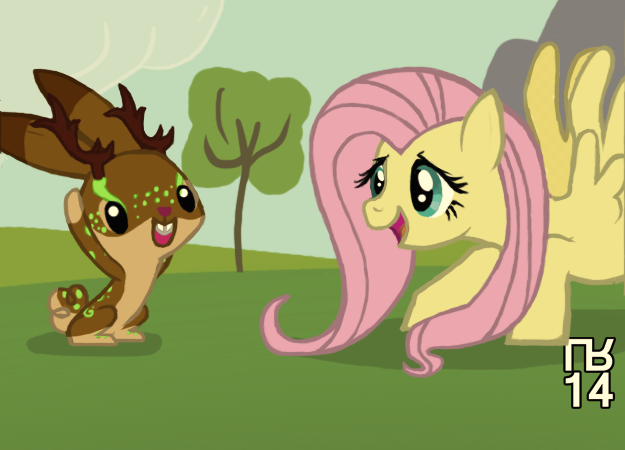 An idea that floated through my head one day, how Fluttershy would react to encountering an astonishingly adorable Jackalope. I imagined it would be similar to her initial reaction to Spike as Jackalopes are also a mythical beast. So here we have Mac in an adorable feral form meeting Fluttershy for the first time. Isn't he just so cuuuuute. <3