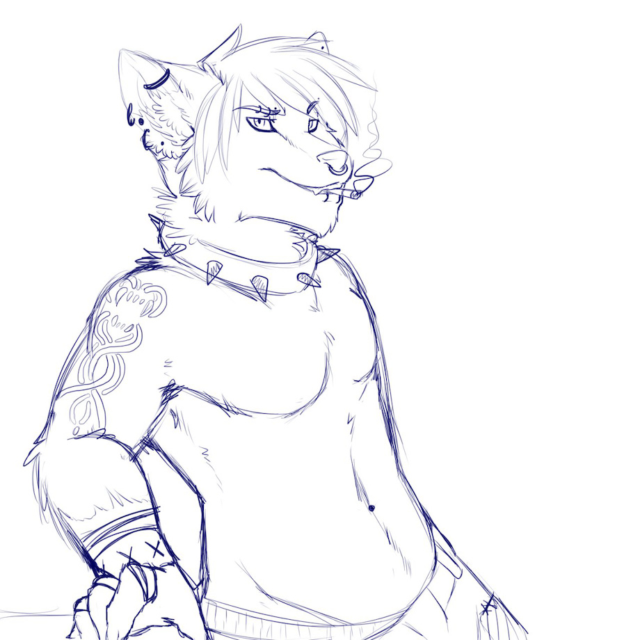 Oneiros~ was sketching one of their own characters in a sort of punkish getup and made the joke that it was his alterego and that his name was the same as his normal name spelt backwards. I happened to mention it would be amusing if Dark's alterego Krad was a punk with tatty clothing and piercings and they decided to sketch this.