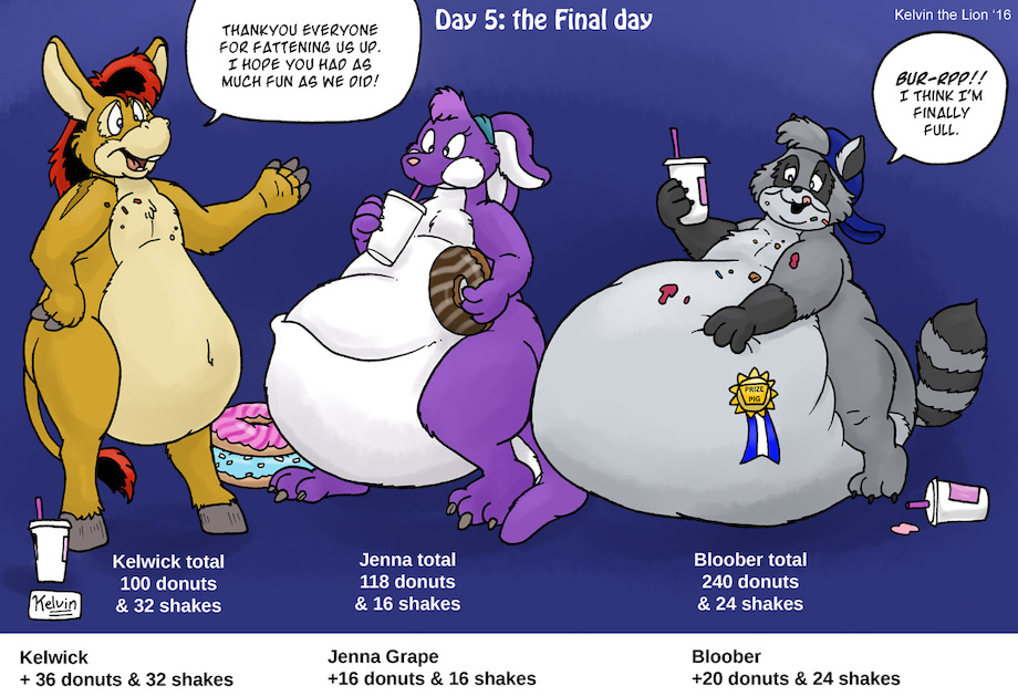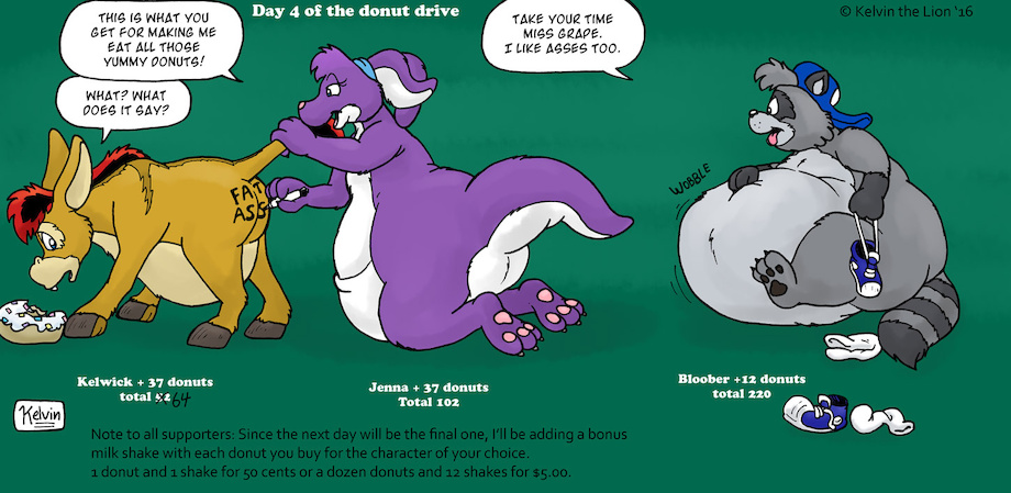 Here's how it works: Send contributions to https://www.paypal.me/kelvinthelion and tell me in the description which character you want to fatten up. You can also buy donuts for multiple characters at once. 50 cents buys them a jumbo donut and they will eat all the donuts you buy for them. If you don't choose a character, I will have to choose for you. All contributions must be sent as goods/services payments. I don't want Paypal to shut my account down for accepting gift payments for a business.