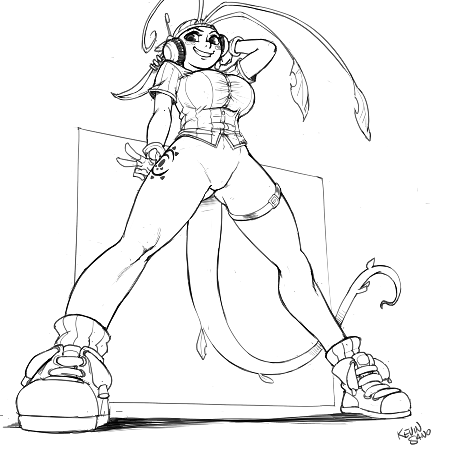 Nice job on the perspective, she looks really spunky x3 and just fun. I like how you drew her sneake