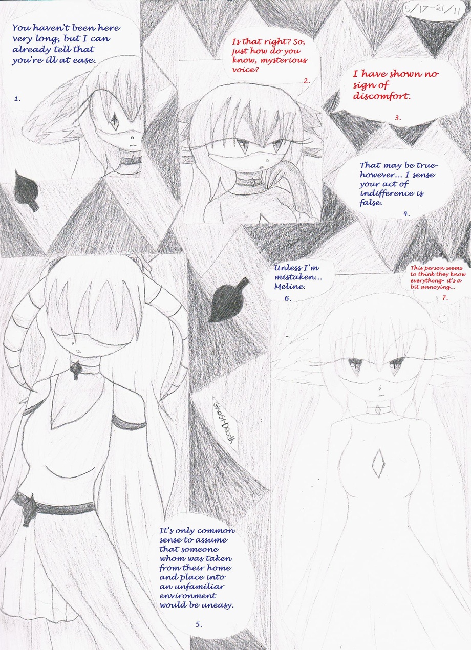 Also, the reason Meline (the racoon girl) says, "mysterious voice" and "this person" is because the person talking to her isn't within her view, despite how it may seem. o3o And the numbers at the bottom of the speech/thought bubbles is to show you the order they should be read in, since the arrangement is a bit odd.
