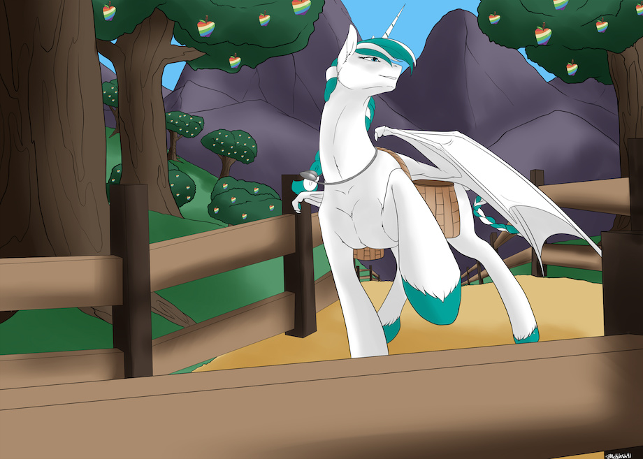 When the foal looked out form the stallions protective legs, she could see a huge gathering of other equines coming over tot he barn. Including 4 alicorns like her mother. One was the purple one who was standing by as back up for her dragon friend. One was pink with a handsome white and blue maned unicorn stallion by her side. One was white with a rainbow colored mane and was the biggest of all the Alicorns, the same height as her mother. And the last one was a dark nightshade blue with a mane that flowed like rippling water and looked to be the blue/black night sky with stars.