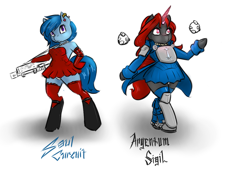 The last are my own OC, Argentium Sigil and Soul Circuit (yes, their names are misspelled. I'll fix it later) for a project to be revealed later this month! The style is known colloquially as 'Semi-Anthro' and I super dig it.
