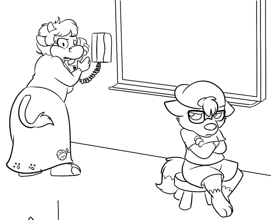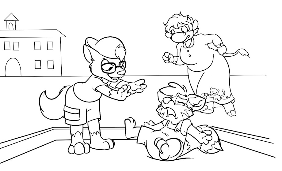 “I don’t care where he was playing or what he was doing you do NOT bully other cubs. Especially our friends and family.” Lectured Cheryl as she grabbed Kyle’s paw and dragged him to the hallway, “We’re going to have a LONG chat about this behavior. I’m VERY disappointed in you.”
