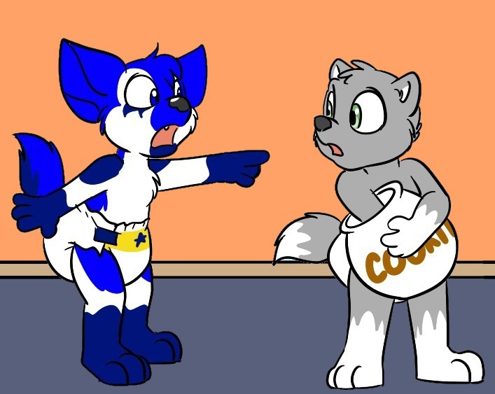 “Ah ah, hold up one moment there big guy-“ said the fox as she pulled on the back of Caiden’s waistband and took a peek “Uh huh, just as I have suspected. We need to change your diaper first stinkerbutt.”