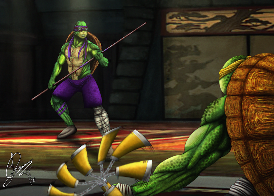 Wow, what a phenomenal image! Can't stop staring at Mikey's arm. The shell texture is amazing, must have taken forever. Love Don's stance, he's so ready for his little bro'!