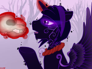 Darkness had fallen over the Everfree Forest as a dark colored alicorn walked down an ancient pathway that was overgrown. He peered through the gloom and looked around, pausing in an ancient graveyard that was full of fresh looking graves. Dark Vortex lit several torches and stalked among the tombstones before halting before a freshly dug grave and smirking “ahh I remember you. Yes, you found my home out here so you had to die. I couldn’t risk you telling them about me and preventing me from bringing back my mistress.” Vortex looked around the graveyard, his flaming eye lighting up and glowing brightly, showing many black magic runes painted around to keep the wandering souls from returning. Vortex smirks and stomps the ground, a fresh rune appearing and the skull lifting up out of the ground and resting on the surface. Vortex picks up the skull with his magic “ahh Bright Cloud, I knew you well once, long ago.” He stared at the skull and lifted it up to the cold light of the moon “you know it was just too bad I had to kill you. I hope you realize it wasn’t personal. You simply had to die.” He chuckles darkly to himself and looks up at the moon “my parents are buried here somewhere, I should know, I killed them and buried them here.” His flaming eye blazes a little brighter and the purple runes on his body swirl with dark magic, the skull around his neck shimmering a little in the moonlight. Dark Vortex throws the skull away and it shatters on a nearby tombstone, making the evil alicorn laugh “oh dear Bright! Your lost your head and shattered your crown!” Vortex laughs as he exits the graveyard and pauses at the entry “Bodies of those long past RISE AND SERVE ME!” the ground shakes and trembles as skeletal hooves rise up out of the dirt and skeletons pull themselves up, glowing with dark magic and falling into line. A dark and wicked looking smile crossed Vortex’s face “perfect. My army of darkness and death is almost complete. Soon we can march on Canterlot and take over and bring back Nightmare Moon!” He uses his magic to blow a skeleton apart and pick up its skull “mmm a fresh pony to talk to. Come my army. Time to join the rest.” He stalks off into the forest, followed by the freshly exhumed skeletal army behind him.