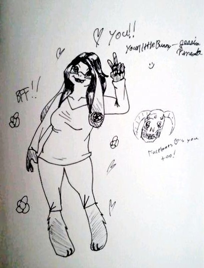 My fursona Emo Bunny as a chibi, drawn in my best girl's yearbook alongside doodles of flowers hearts, and a little Facebones from Metalocalypse
