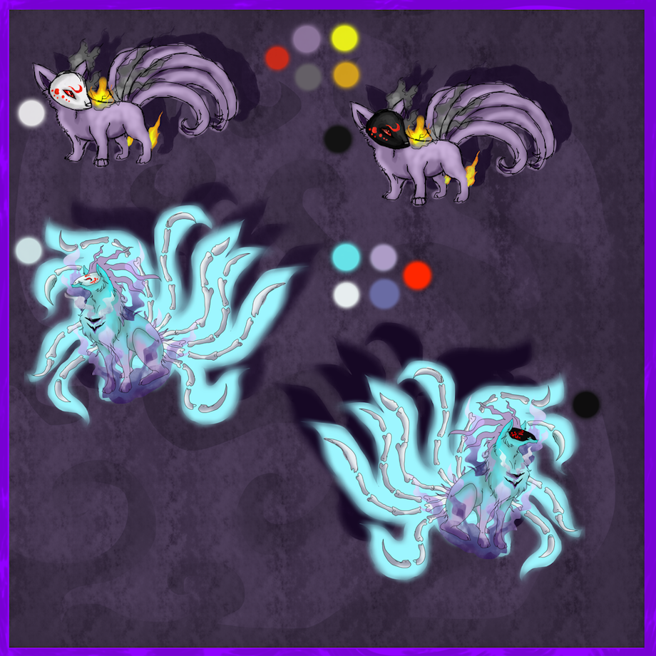 Description: Nibuka resembles their living counterparts; Vulpix, but appears to have masks different in colors from blue, red, black and white that covers their faces fully. Those masks cover their faces, somewhat of a hard, outer shell. Think of the masks from Halloween that kids would wear of the Bleach show. (Think of when Ichigo goes human with Hallow Mask.) The mask have markings on it, looking like blood stains on it.