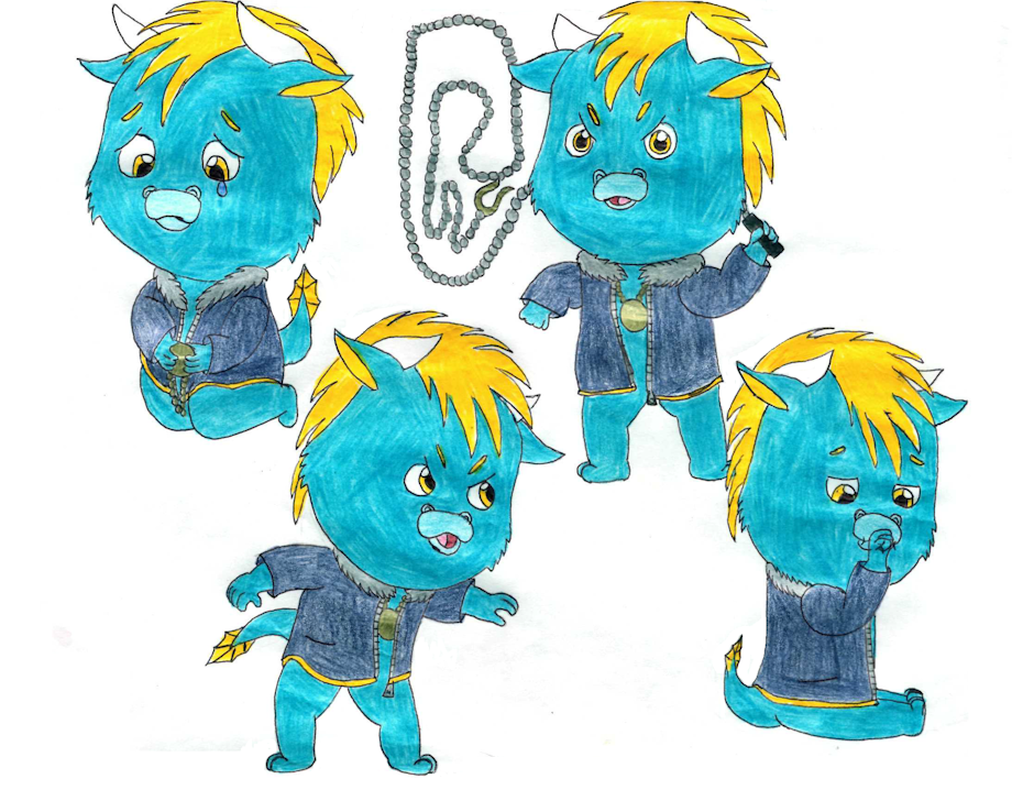 THis is Cole, he is a 4 year old Behemoth that has traveled with his father through the Plains of Make-Believe to arrive in the Neighborhood of Make-Believe as a new resident. His behavior can be quite limited since he is quiet and shy due to a terrible incident that has happened when he was but 1 1/2 years old that he never talks about. He is blessed with a sacred whip that was meant for dispatching dark creatures that threatened his home and thus his father and him had to flee. He has regressional tendencies whenever he gets nervous or anxious about problems which involves him sucking his thumb or whining despite he tries to act like he is in control and can be quite stubborn at times. He wears a small jacket with fluffy neck sides and dons some kind of locket around his neck. No one knows what's in for he never wants to share or talk about it. it does seem to make him sad when he looks at it though.