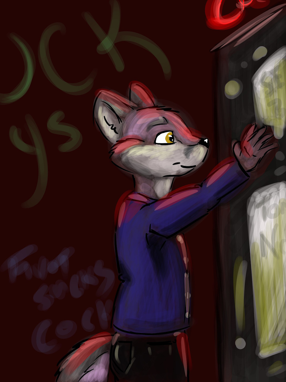 Sabian's arrival to the bar had not gone unnoticed by any of the regulars. Sitting in his dark corner Penn Tang Machine knocked back his drink, eyes fixed on the young pink-furred fox. Penn had a light buzz going on by this point, enough to still be clear headed and just enough to be randy as hell. He had to make his move on the newcomer before someone else came in and cock-blocked him.