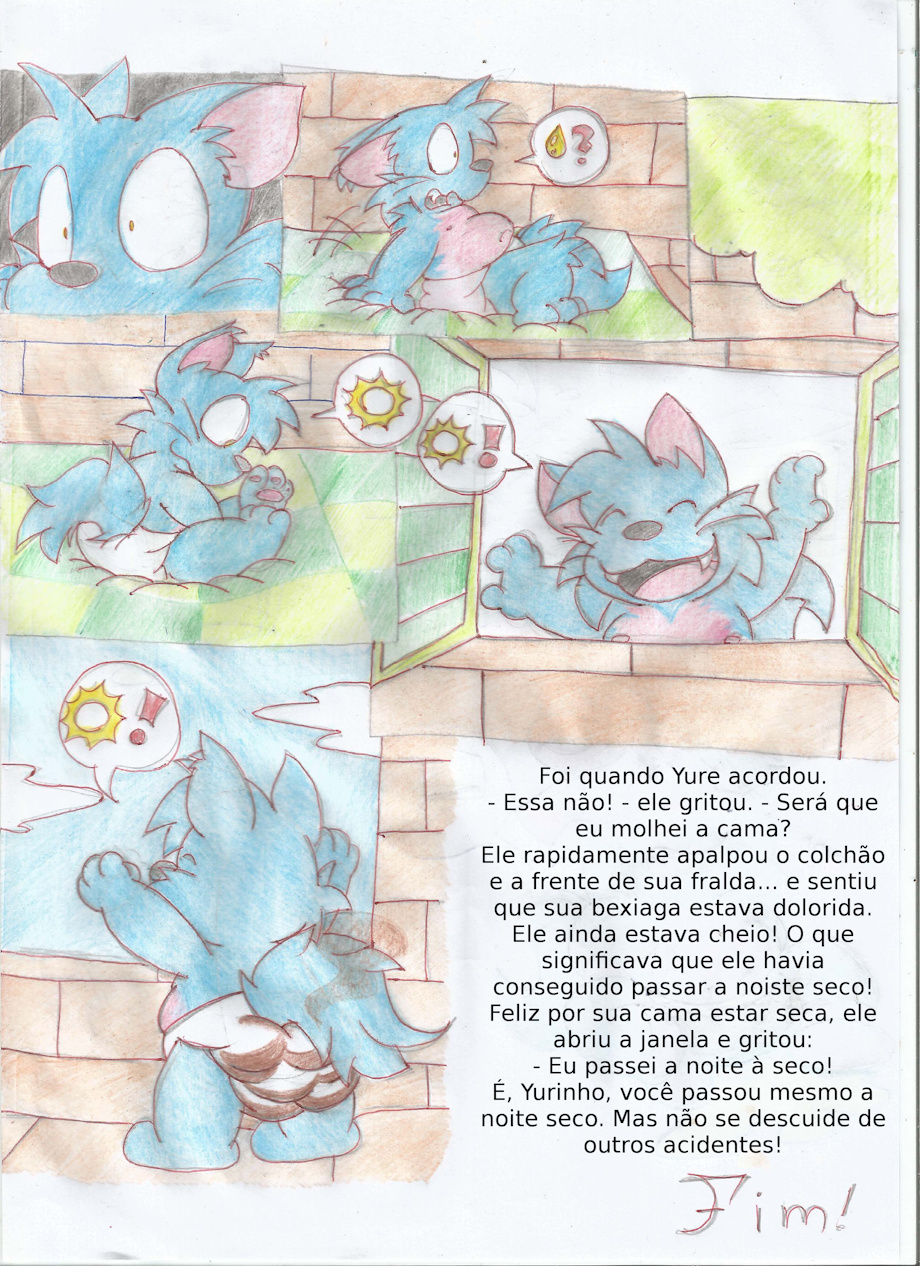 Once upon a time, there was a cat name Yure. That cat, poor thing, had a small problem: he peed the bed. Every night, he would promise to himself to control his wee, but always failed. That night, as usual, he wore his diaper and took a cup of water. Then, he fell asleep. In the dream, he woke up in a crib, much smaller than his bed. He was also sucking on a pacifier! He, who always slept with the lights on, was scared to find everything dark. The dream was very real. It was like he was in his home, in the same place were the bed used to be, except that now the bed was a crib, the lights were off, he was sucking on a pacifier and even had baby mittens. "What is going on?", he thought to himself as the moonlight bathed him through the open window.