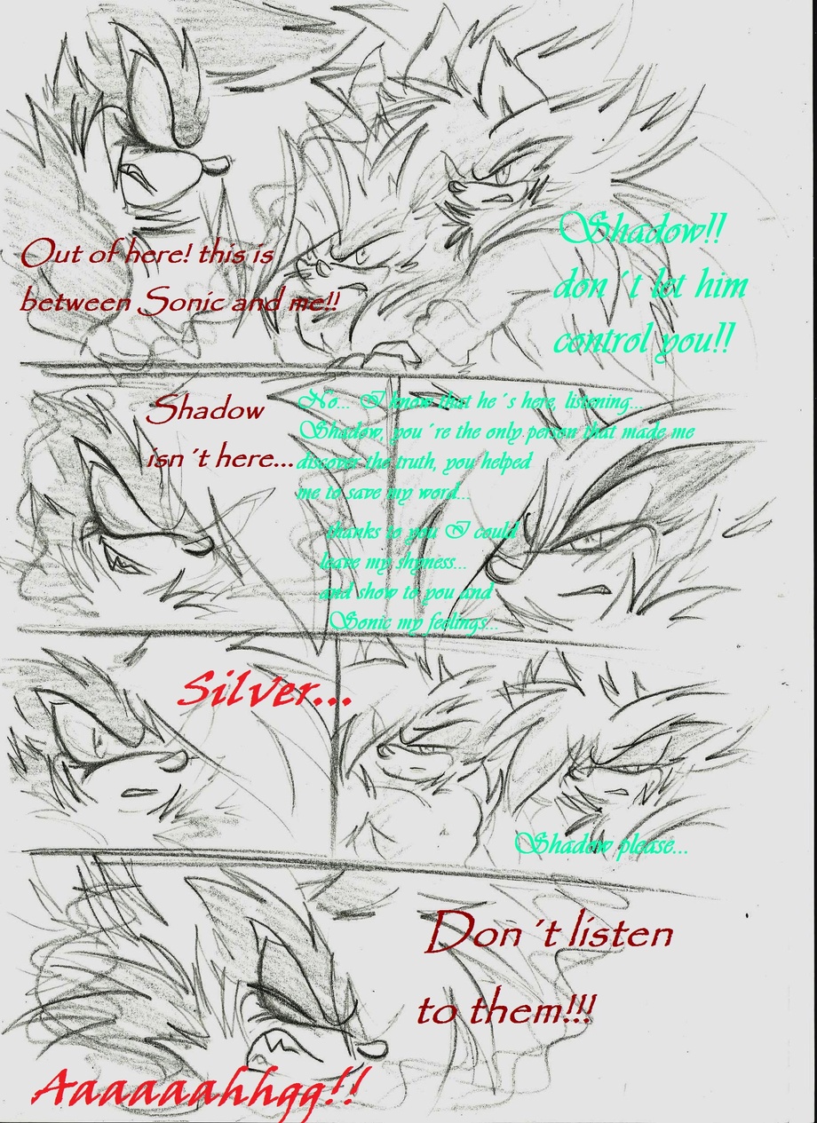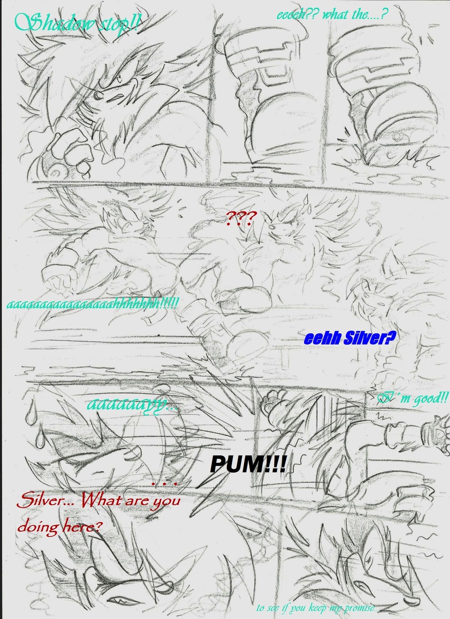 ooooh Silver a llegado a rescatar a Sonic... pero claro, a Shadow y a Sonic se les olvidó limpiar los restos de la juerga de antes jejeje y con las prisas... pues pasa lo ke pasa... jajaja un pokillo de humor pa una historia ke se está volviendo muy complicada y enrevesada XDDD