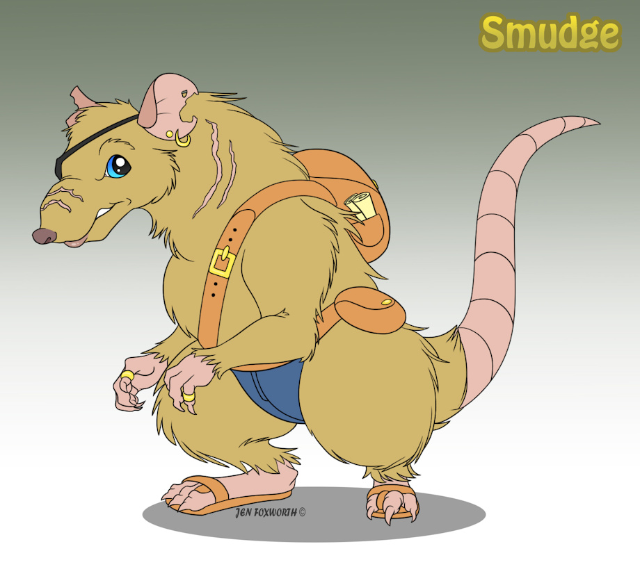He's a rather large anthro/alien packrat creature that originally was used for experimentation in the Dr.s lab, hence the scars and missing eye.