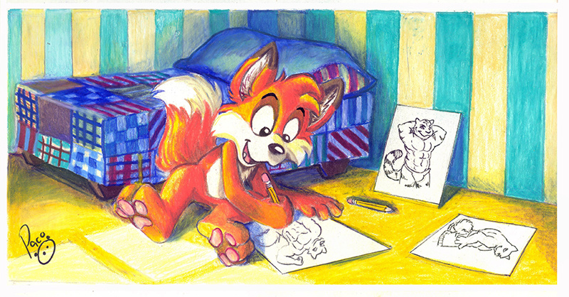 I think this picture is ironic with this toony character who is enjoying drawing musclefurs, what do you think his mom is going to say when he shows her those drawings?