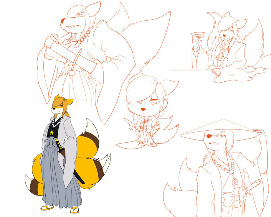 I finally got around to designing a companion character to go with Moriko, after a hell of a lot of delay and debating. I knew I wanted to make a kitsune character of some sort, though I flip-flopped on what gender, if they'd be related to Moriko's story at all, stuff like that. Eventually I settled on Haru's current design.
