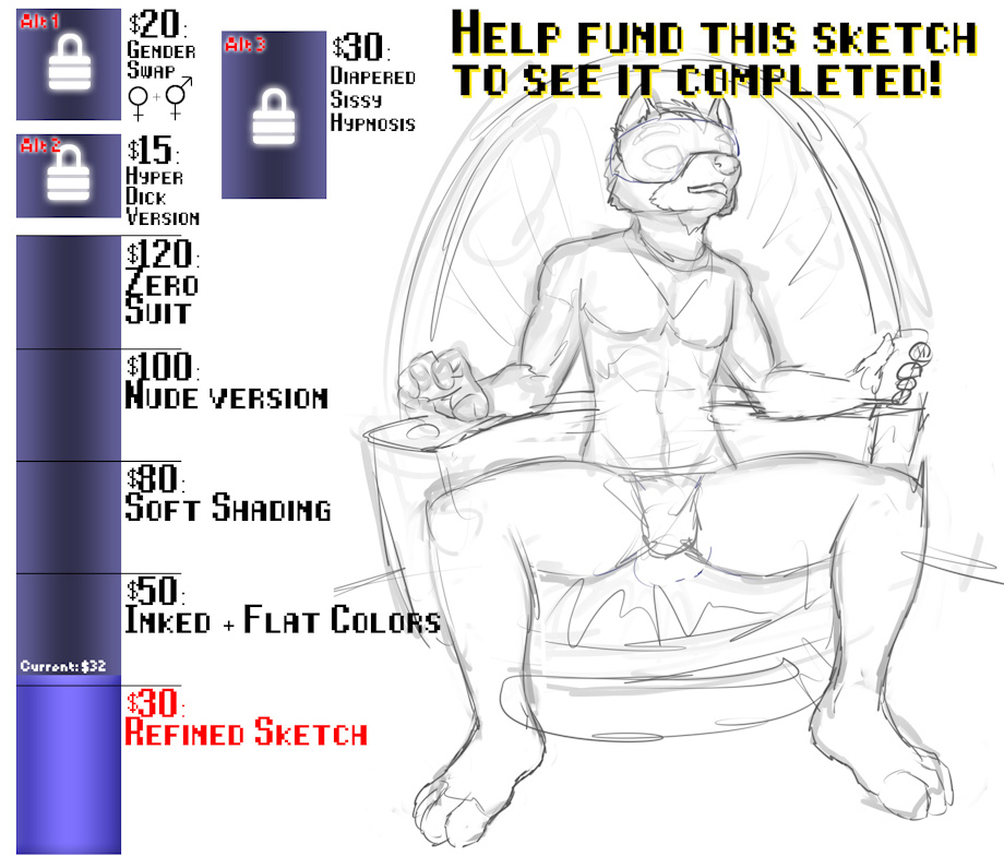 More details on all the versions: Alt 1: Gender Swap – A female and dickgirl version of the nude and zero suit Fox. In these images, the VR pod will seem to have a more hypnotic intent! Alt 2: Hyper Dick Version – He’ll be nude and extra endowed, maybe like 3 feet long. Alt 3: Diapered Sissy Hypnosis – The VR machine has turned into a hypnosis pod, and the dumb fox will be padded and dressed as a girl! This is only for the male version.