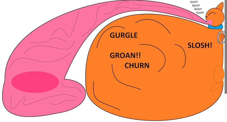 Leroy smiles and nods as he lets out another loud burp and blushed. "Heh right, I can do that. Now then lets get this started I can't wait to get started." He smiled and laz laughs as he leaves the room, the tank slowly opening and once it did the strawberry bloblush spills out, being a lot bigger then the bio card said, almost 800 gallons in total and Laz was surprised by this. "Heh seems hes a bit bigger then we thought, hope your ready." Laz says over the speakers and Leroy nods. "Bring it on big guy." He happily opens his mouth as the thing slowly oozed over and went right into his waiting maw. He gulping down large chunks of it, as big as he could handle and just murrs happily as it slides down his throat, tasting like it was made of yogurt. It was very sweet and even had those little chunks of strawberry in it as he swallows it, the chocolate bloblush getting more active as it felt this new goo flowing into its home. The two slimes get so active it made Leroy's belly shake wobble churn and bulge a lot more then before, the bulges being more prominent and bulged out more, even the gurgling and churning got louder as he just purrs between gulps.