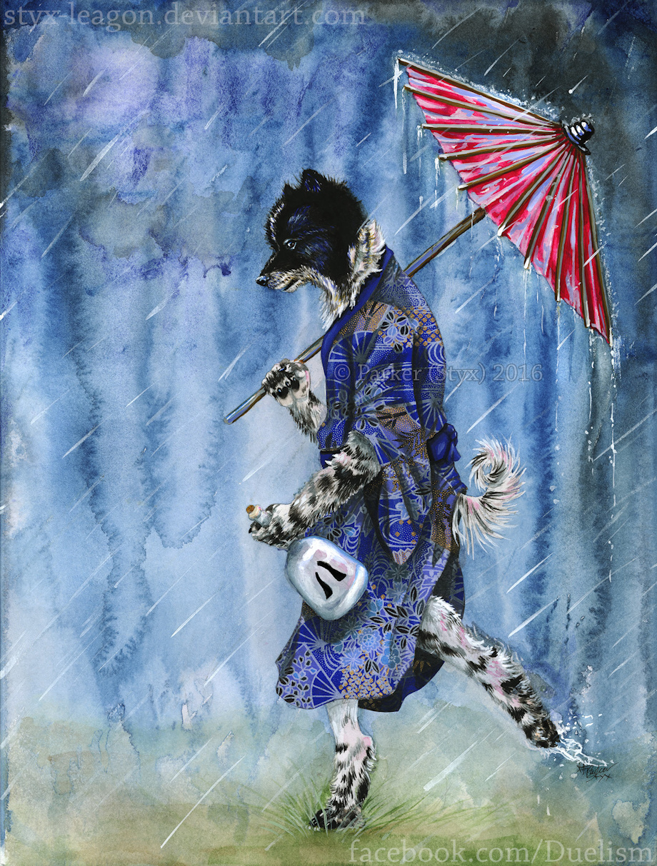 On a rainy night Tanuki carries a tokkuri to acquire some sake.
