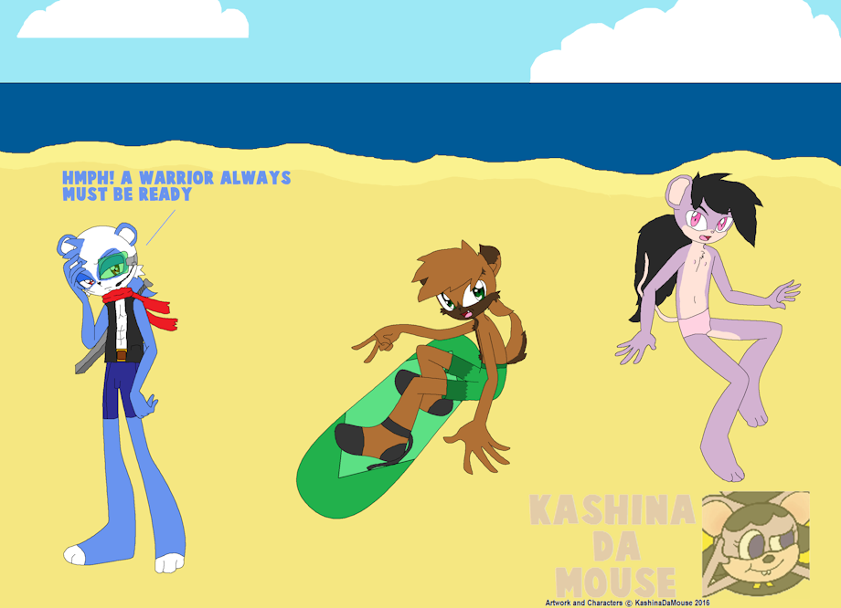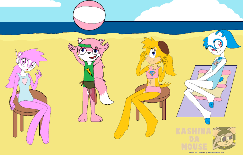 Angela Maximus (standing): The younger sister of former character Angelina Maximus (now named B. Vehry under kaokao) She is sporting a green one-piece with a lightning bolt on the front and is topped off with a dark red sarong. She also tops the outfit off with a green sweatband.