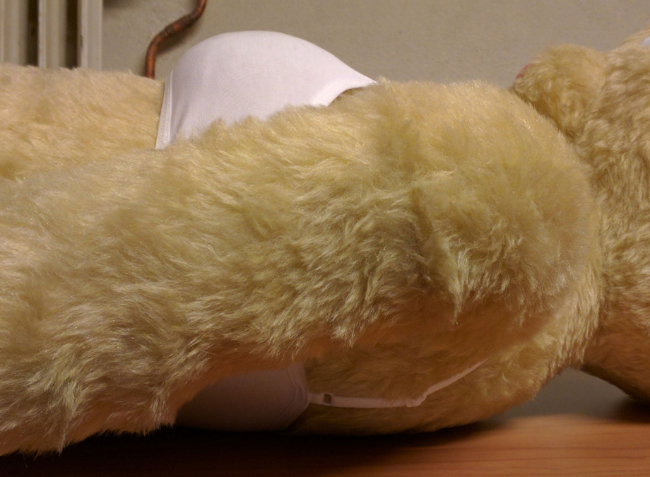 Included with the plush is a black lace dress, and white panties with matching white bra.