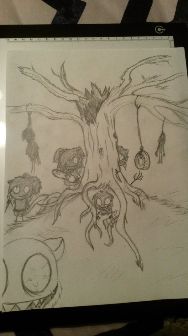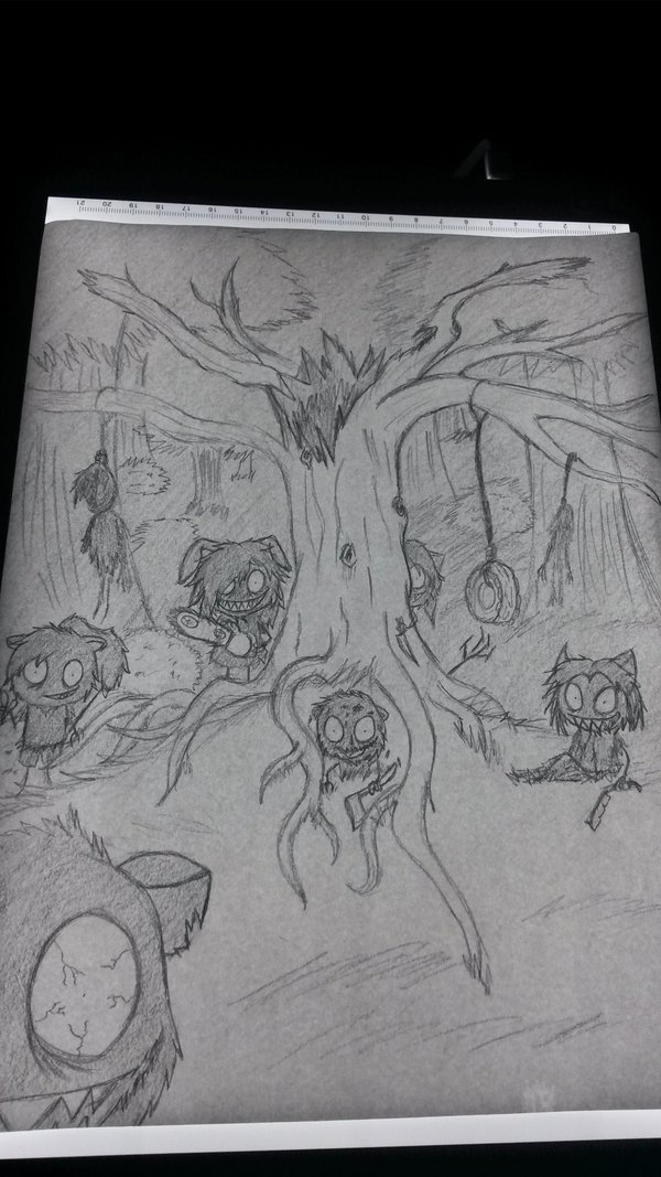 A few days ago i worked on this picture with just the one bunny character, but it felt empty. It was creepy but not enough. Hearing some helpful advice i expanded the character range. I used my light table to quickly make a deep background over this and applied it along with the dark shading. It took me all day because of doing errands with my aunt. Overall i love this picture the most!