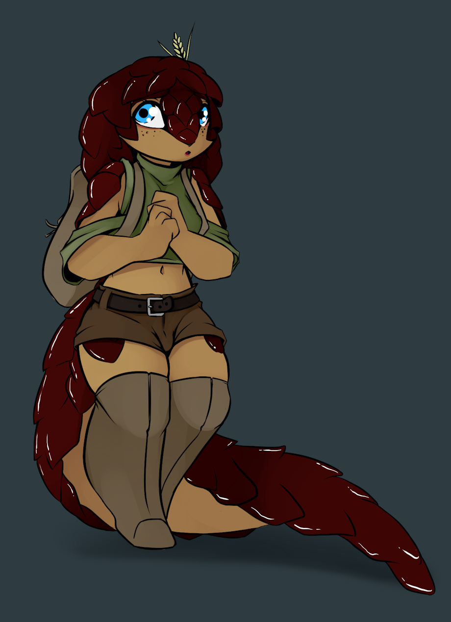 Part of a collaboration with yggdrasill00 . This is Pippin the Pangolin, the shy twin brother to Ygg's Pascal http://www.furaffinity.net/view/19926397/ . While still bi like his brother, he's less of a flirt and very reserved and easily flustered by sexual situations. He's a bit of a nature nut, always outdoors hiking, likes to bird watch and plant/tend to trees and desert plants. Basically he has a personality if took Fluttershy and Tree Hugger and combined them, but took out the later's obnoxious "vibes" stuff and stoner demeanor, and threw in a lot of femboi cuteness. The idea for him came about after seeing a meme posting cycling about pointing out that Pangolin's always look like they're wanting to ask you something but are too shy to do so, after which I had the thought "gee, almost wanna say that Alphys in Undertale is a pangolin rather then a lizard/dragon/reptile, as she's always posed like that". Then I thought "I should make a character, they're cute" and upon doing more research on the animals found out they're one of the most heavily hunted and illegally trafficked animals in the world. So decided "yup making a char, if just to get them more attention and love"