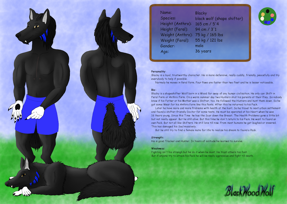 Blacky is a shapeshifter Wolf born in a Wood far away of any human civilisation. He only can Shift in Feral Form or Anthro Form. On a warm summer day two Hunters shot his parents at their Prey. So nobody know if his Father or his Mother was a Shifter, too. He followed the Hunters and hunt them down. So he got some Wear for his Anthro form like this Pants. After this he returned to his Pack.