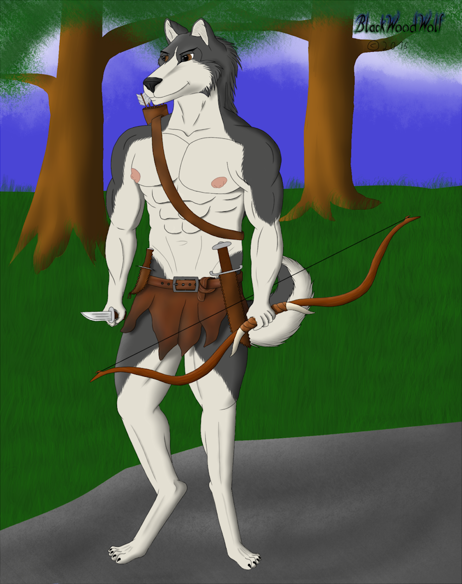 His weapons are a double-curved hunting bow, arrows with miscellaneous arrowheads, a long dagger and a skinning knife and a hunting knife. He is very skilled how to use the bow and the knives. He wears just a leather armor with a belt for his knives and a loin cloth.
