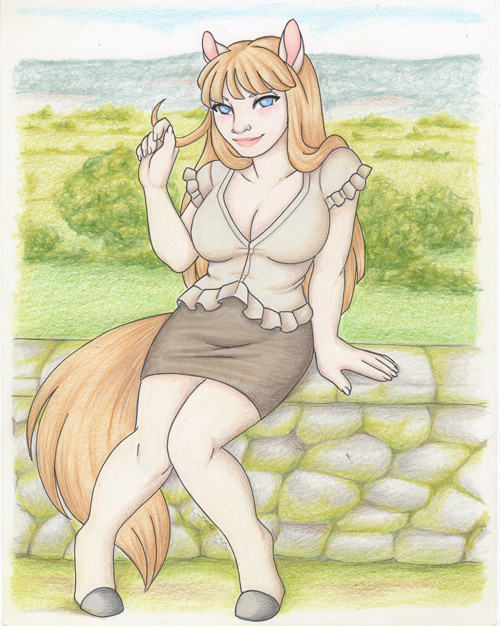 This is Bess Dhomhnaígh, an Irish Gaelic mare. She actually was/is my first furry character (I made her up back in 1997). Here she is again, sitting on a stone fence that borders the town she lives in, eagerly waiting for someone... but whom?
