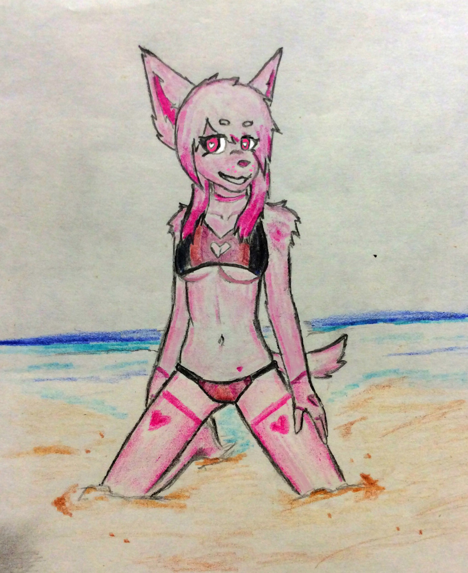 This is Collete. I drew yet again for the free art group I joined. I didn't ask her owner what her species is but the ear size implies some sort of fennec fox mixed with something with a short tail. I actually based the arms and lower body off of a swim suit magazine photo. The photo had one knee in the sand and the other out of frame, so I followed in like fashion and put the knees in sand. I also tried a 2 & 1/2 head torso length instead of hap hazardly drawing a 2 head length torso. One detail that might be hard to see is that her eye pupils are heart shaped.