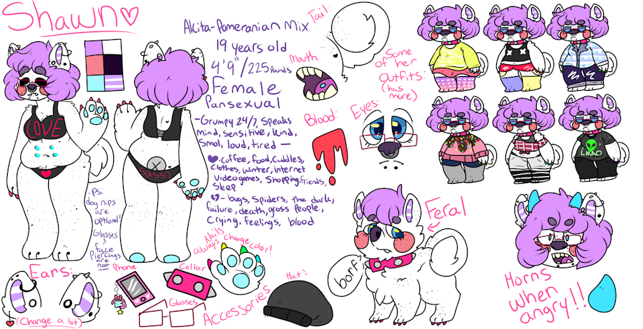 Shawn is a short, chubby dog breed. She has white fur, purple short hair, and freckles everywhere. She has long claws (always painted!!), a septum, some ear piercings, and snakebites. She also has blue, glowing nipples with nipple piercings. She has a curly fluffy tail, and is just fluffy in general. Her pawpads are a bright blue, and are super soft.