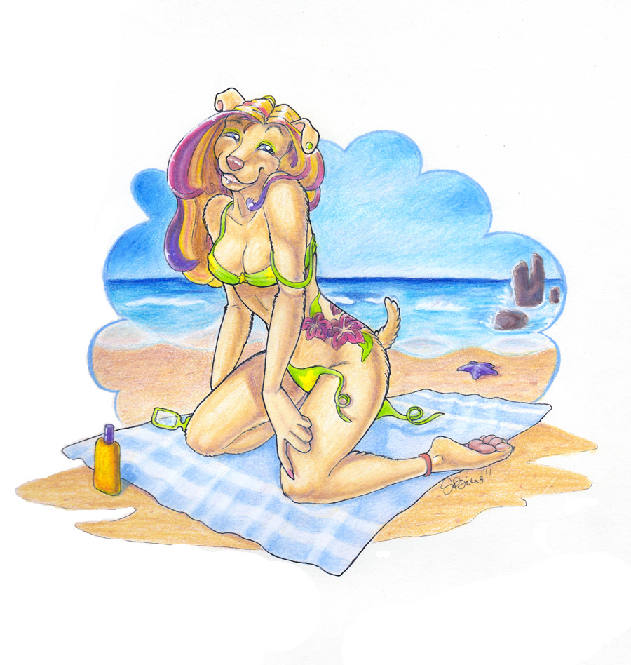 Trying to mix some personal art in. I decided to do a pin up of someone on the beach. This image was inspired by a painting of Betty Paige, I just updated it a bit and made my doggy gal a fun-loving punk who loves the beach. Right now she is enjoying the sun, sand, and maybe jokingly allowing her bikini to slip off for anyone who stares at her too long.... Guess you were staring ;>
