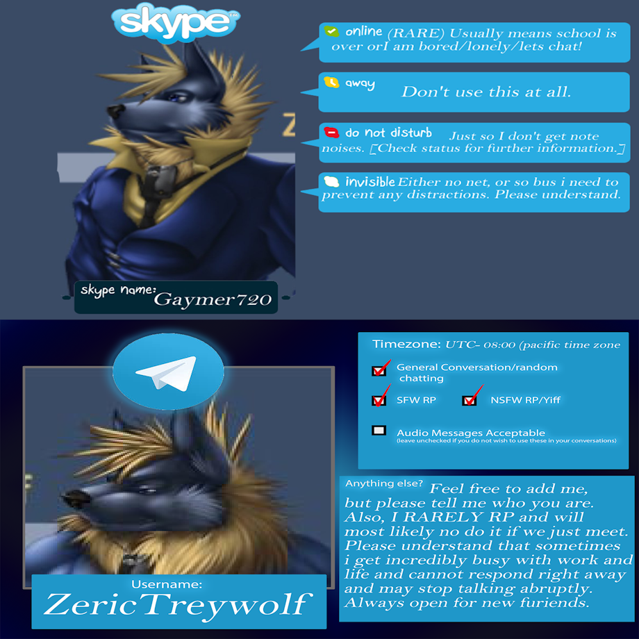 Here is my info for those who want to add me. The meme for Telegram is done by the great :iconSilver_Shadowheart: